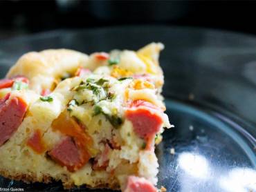 Unte uma forma, jogue a metade da massa, acrescente a salsicha picada e os outros ingredientes do recheio