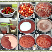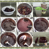 Quando o doce de morangos atingir o ponto de brigadeiro mole, acrescente o suco de uvas frescas, que foi obtido do mesmo modo que a polpa de morangos, ou seja, fervendo as uvas, batendo no liquidificador e coando, e deixe o doce apurar, mexendo sempre, até chegar em ponto de brigadeiro firme.