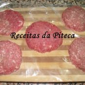 Com pedaços de carne picada faça círculos finos (do tamanho que desejar, mas todos mais ou menos do mesmo tamanho) e coloque-os numa tábua de cozinha forrada com papel vegetal ou outro, separados uns dos outros até acabar com a carne. Tenha em conta que têm de ser sempre pares. Em metade desses círculos coloque por cima de cada um uma fatia de fiambre e outra de queijo. Tape-os com os restantes círculos de carne, fechando bem a toda a volta de forma a que o queijo e fiambre deixem de se ver.