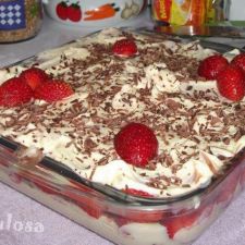 Derreta o chocolate em banho maria. Acrescente o creme de leite, sem soro e misture com auxílio de um fuê. Jogue por cima do "tijolinho" e decore com morangos.