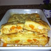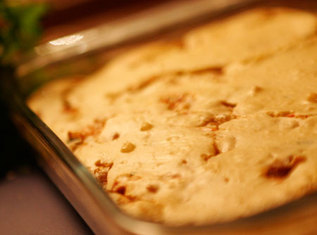 Bata todos os ingredientes da massa no liquidificador e pronto. Numa forma refratária, untada com margarina e polvilhada de farinha, coloque uma camada de massa outra de recheio e o restante da massa. Coloque no forno para assar por mais ou menos meia hora.