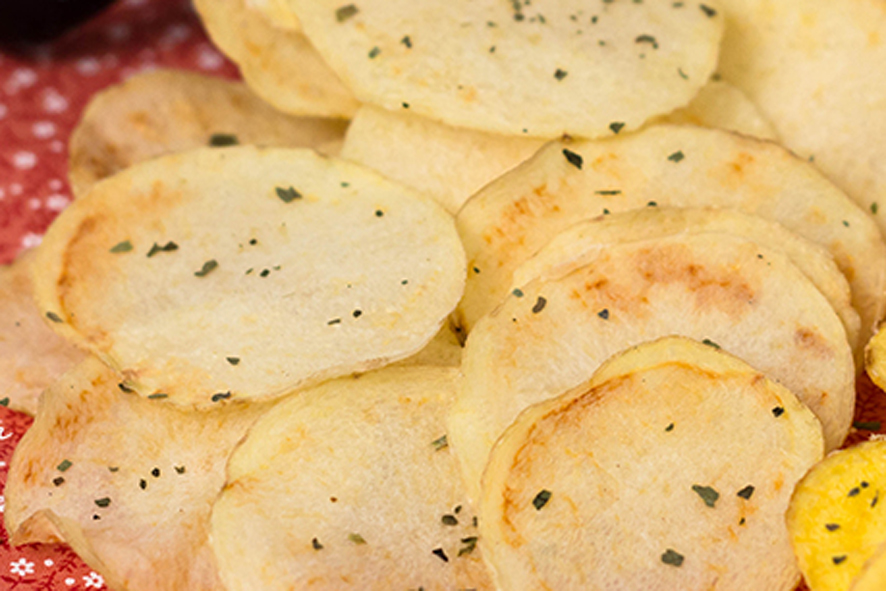 Lave bem a batata e corte com a ajuda de um fatiador (ralador), elas devem ficar fininhas.