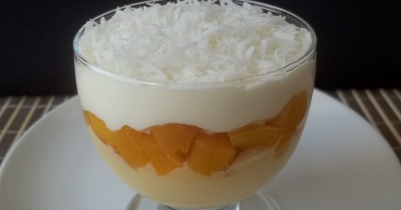 Em um recipiente ou individuais colocar o creme de gemas, pêssegos em cubinhos ou fatias, creme quatro leites e cobrir com o coco ralado