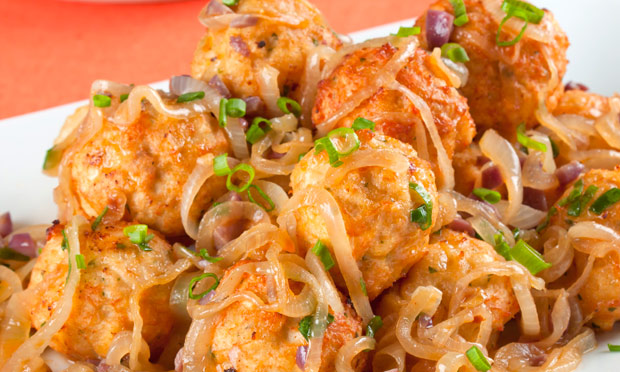 Coloque os pãezinhos de molho no leite por 1 minuto. Esprema-os, pique-os e misture com o frango, o ovo, a salsa, o sal e a pimenta. Molde as almôndegas, coloque em uma travessa, cubra com filme plástico e leve à geladeira por 20 minutos. Em uma frigideira, aqueça o azeite e doure as cebolas, mexendo. Tempere com o sal, a pimenta, a páprica e cozinhe até a cebola ficar macia. Desligue o fogo, junte as azeitonas e salsa. Reserve. No óleo quente, frite as almôndegas até ficarem douradas. Coloque-as em uma travessa e, por cima, distribua a cebola.