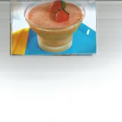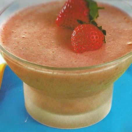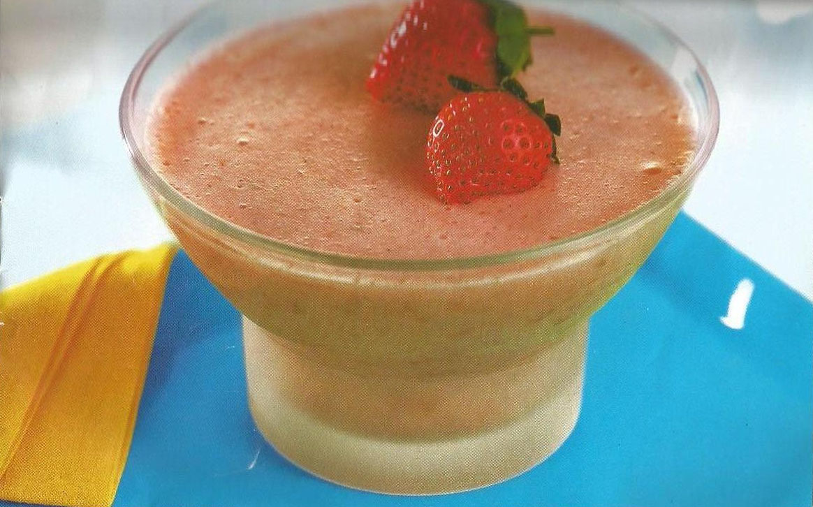 - 2- Junte á gelatina cinco colheres (sopa) de água fria e leve ao fogo, em banho-maria, para dissolver. Junte-a ao creme de morango e misture bem.