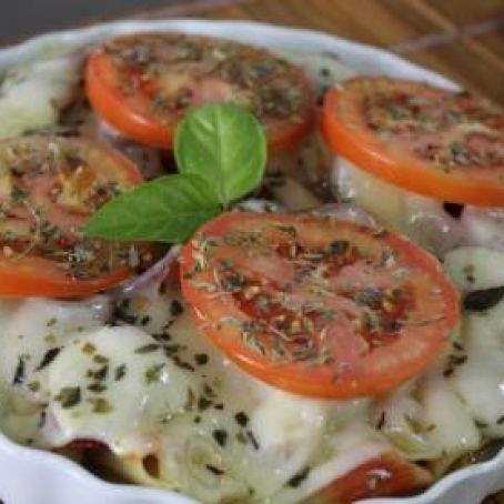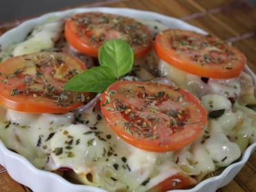 Em um refratário redondo, untado, acomode a massa cozida, cubra com molho de tomate , lingüiça queijo mussarela, rodelas de tomate, folhas de manjericão e polvilhe orégano