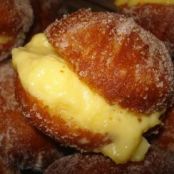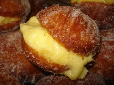 Passe os sonhos em uma mistura de açúcar refinado com canela, corte-os ao meio e recheie com o creme