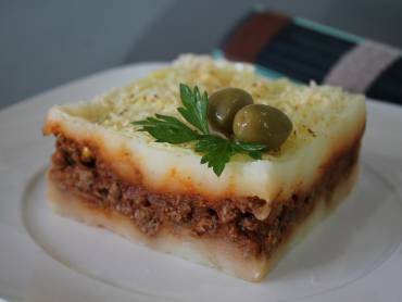Coloque um pouco do purê na travessa, o recheio e o restante do purê