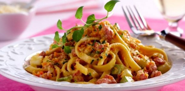 Cozinhe o macarrão al dente, escorra e coloque em uma travessa.