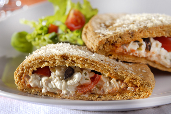 Antes de tudo, prepare o recheio do calzone. Em um recipiente, misture a ricota, o queijo cottage e a cebolinha e reserve. Coloque um dos discos de pizza sobre uma assadeira redonda de 35 cm de diâmetro e com a ajuda de um pincel com água, molhe as extremidades da massa e faça uma faixa no centro, onde ele será dobrado. Em metade do disco, espalhe ½ xícara (chá) de molho de tomate, deixando um espaço de dois dedos na borda. Em seguida, coloque metade do recheio de queijo sobre o molho, espalhe uma parte dos tomates e das azeitonas e salpique 1 colher (café) de orégano. Feche cuidadosamente a massa, vedando bem as bordas, primeiro apertando com os dedos e, em seguida, com um garfo. Depois, polvilhe um pouco de queijo parmesão sobre o calzone. Repita o mesmo procedimento utilizando o outro disco e o restante dos ingredientes. Leve-os ao forno pré-aquecido (180 °C) durante 30 minutos, ou até que os calzones fiquem dourados. Sirva quente.