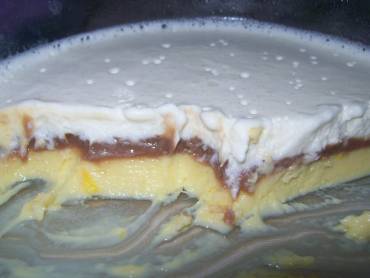 Cozinhe todos os ingredientes em fogo baixo, mexendo sempre, até engrossar, coloque por cima da 1° parte, reserve.