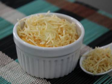 Coloque o refogado numa assadeira, cubra com mussarela e espalhe a batata palha por cima