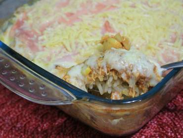 Então em um refratário médio faça a montagem do prato, coloque primeiro o arroz, depois o creme de leite e o espalhe, em seguida o frango no molho e espalhe, depois requeijão cremoso, presunto, queijo e para finalizar a batata palha
