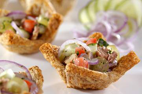 Quando as cestinhas estiverem prontas, retire-as do forno e deixe esfriando sobre uma grade. Quando estiverem frias coloque-as sobre o prato em que for servir e recheie com o auxílio de uma colher. Sirva acompanhada de saladas.