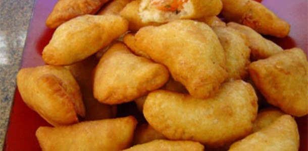 Faça bolinhas e abra em uma superfície lisa, recheie e frite em óleo quente até dourarem
