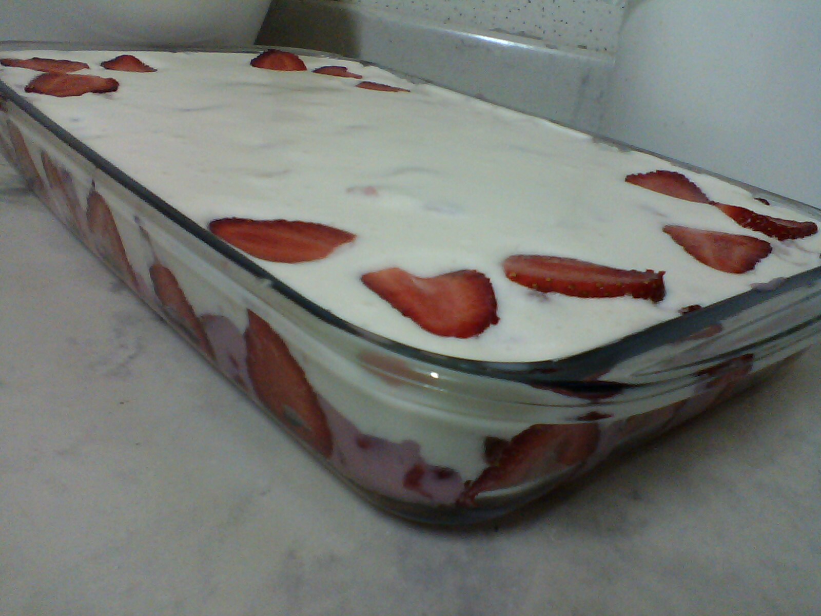 - Massa de brigadeiro mole,morangos picados com pouco açúcar,clara em neve e creme de leite.