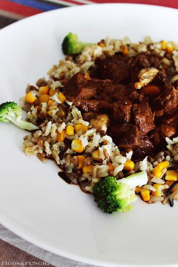 Já na panela de pressão aqueça o óleo e refogue a cebola. Junte a carne, tempere com pimenta e sal e refogue até dourar levemente. Junte o alho, a cerveja e a água. Passe toda a mostarda no pão de forma e mergulhe o pão dentro da panela com a mostarda virada para baixo. Tampe a panela e quando perceber que começou a fazer barulho reduza o fogo para o médio e cozinhe a carne por 20 minutos. Depois desse tempo desligue o fogo, espere a pressão sair e abra a panela. Se o molho estiver mais encorpado a carne está pronta, se ainda estiver muito líquido reduza o fogo para o mínimo e deixe cozinhar por mais uns 15 minutos, mexendo de vez em quando. Sirva com arroz de sua preferência. Dica: Como eu tinha uns 5 cogumelos na geladeira depois que a carne já estava pronta coloquei os cogumelos picados no molho e deixei cozinhar em fogo baixo por uns 3 minutos, mas na verdade nem precisa colocar se não tiver ou se não gostar de cogumelos. Desta vez eu servi o picadinho acompanhado de arroz integral e milho verde, na hora de montar o prato reguei o arroz com o molhinho delicioso da carne e fiquei bem feliz :) Curiosidade: Por que o pão de forma na receita? O pão de forma é usado para engrossar o molho da carne sem ter a necessidade de colocar farinha de trigo ou amido de milho, e como a receita é feita na panela de pressão ao final do preparo o pão estará totalmente diluído. Este truque veio lá da Bélgica e desde então eu uso direto nas minhas receitas. Você pode usar qualquer tipo de pão de forma e em qualquer receita de panela de pressão quando quer um molhinho mais encorpado. Bom Apetite!
