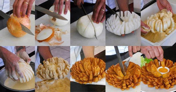 4. A magia desse prato é sua apresentação. A cebola é cortada como se fosse uma flor aberta. Para fazer este corte o Outback utiliza um Blooming Onion Cutter, mas como você não tem um desses em casa vai precisar utilizar uma faca bem afiada. Primeiro corte uns 2cm do topo e da base da cebola (essas são instruções para você que conseguiu uma cebola grande, se estiver fazendo a receita com uma cebolinha pequenininha, use o bom senso). Tire a casca da Cebola. Tire o miolo dela com aproximadamente 2 cm de diâmetro. Agora use uma faca maior para cortar as ‘pétalas’ da cebola. Lembre-se para não cortar até o final e sim deixar uma beirola para a cebola não desmanchar. O ideal é fazer o primeiro corte bem no meio da cebola, girar a cebola 90 graus e cortar de novo fazendo uma espécie de ‘X’ como se estivesse fatiando uma torta. Vá cortando as seções da cebola sempre no meio com muito cuidado até ter cortado umas 16 vezes. Lembrando NÃO CORTE ATÉ O FINAL DA CEBOLA PARA NÃO DAR ERRADO NA HORA DE FRITAR. Os últimos 8 cortes são bem fininhos, use a mão firme e não fique triste se sua cebola não parecer uma flor certinha, porque mesmo assim ela ficará muito gostosa.