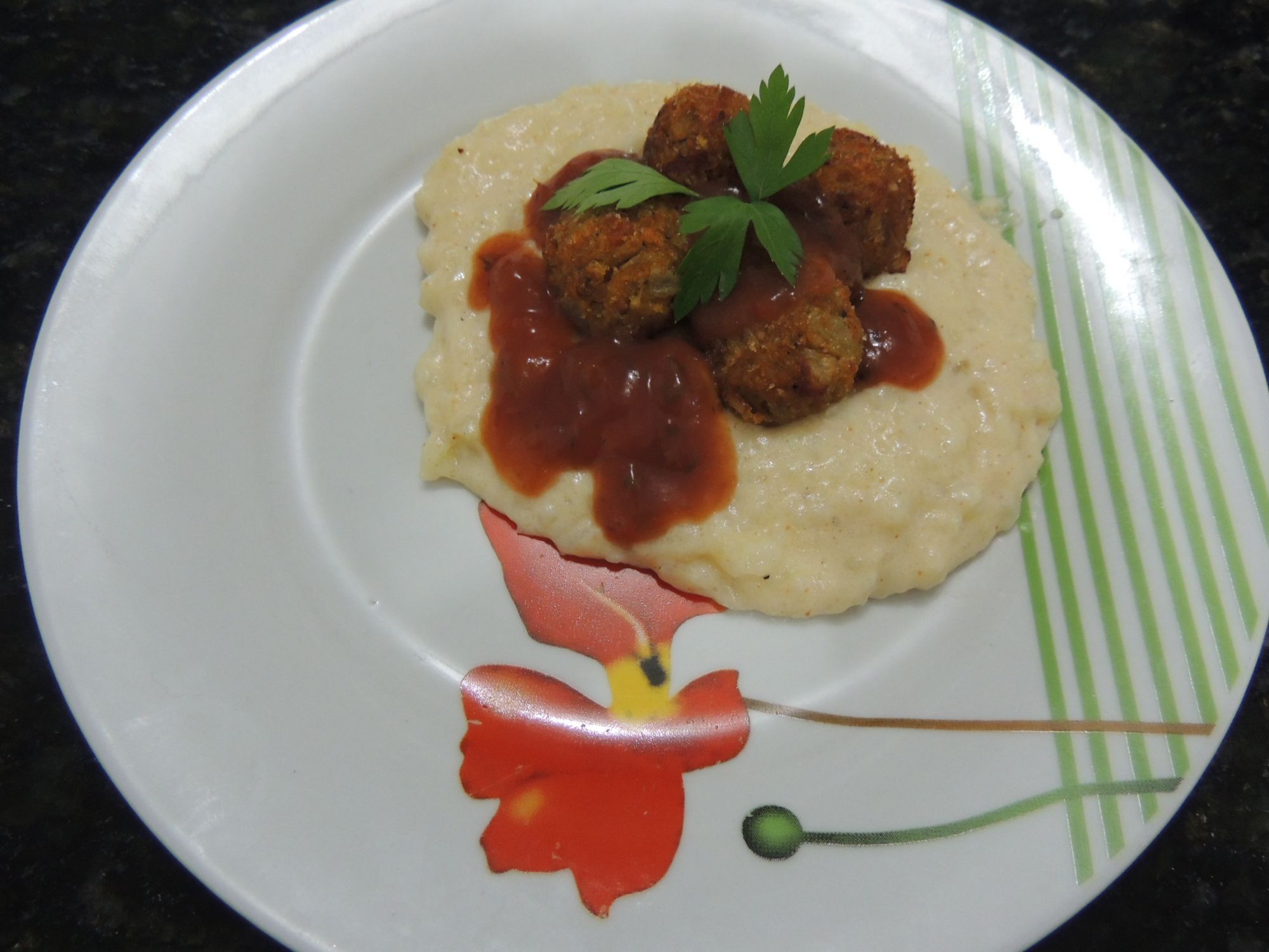 Unte as mãos com óleo, faça pequenas bolinhas e empane na farinha de rosca.
