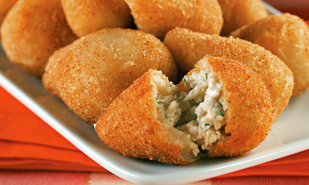 Abra pequenas porções da massa na palma da mão e recheie. Modele como coxinhas, passe-as pela farinha de rosca, pelos ovos batidos e novamente pela farinha de rosca. Frite-as em óleo quente, escorra-as em papel toalha.
