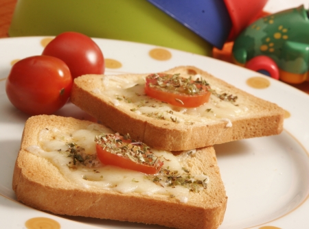 Sobre cada torrada, espalhe um pouco da mussarela, duas metades de tomate cereja, orégano e azeite a gosto. Coloque no forno pré-aquecido apenas o suficiente para derreter o queijo.