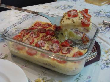Decore com o tomate, polvilhe queijo, orégano e leve ao microondas por 8 a 10 minutos em potência alta até o creme firmar