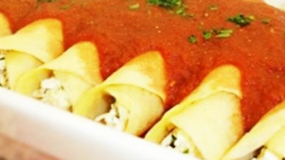Arrume as panquecas em um refratário e cubra com o molho de tomate.