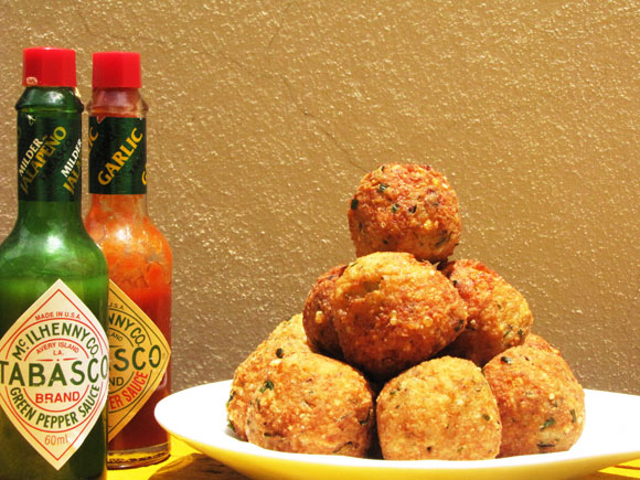 Junte todos os ingredientes, exceto o óleo, numa tigela. Misture bem, usando uma colher de pau ou as mãos. A mistura deve ficar bem homogênea e desgrudando das mãos. Esquente o óleo e leve ao fogo para aquecer. Enquanto isso, faça bolinhas com o auxílio de uma colher. Quando o óleo estiver bem quente, coloque as bolinhas (mas não todas) delicadamente para fritar. Retire quando estiverem douradas e deixe escorrer no papel-toalha.