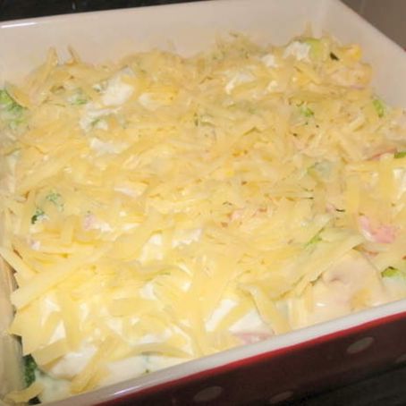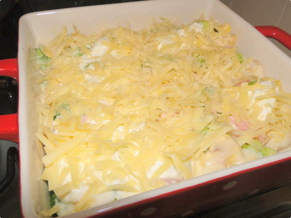 Acomode-os em uma recipiente que vá ao forno, tempere com sal e se preferir com temperos prontos e preencha os espeços com os pedacinhos de peito de peru e mussarela.