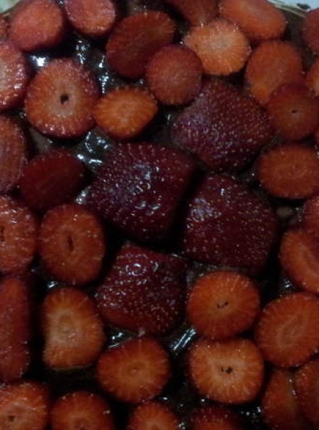 Deixe esfriar e coloque os morangos cortados no meio por cima.