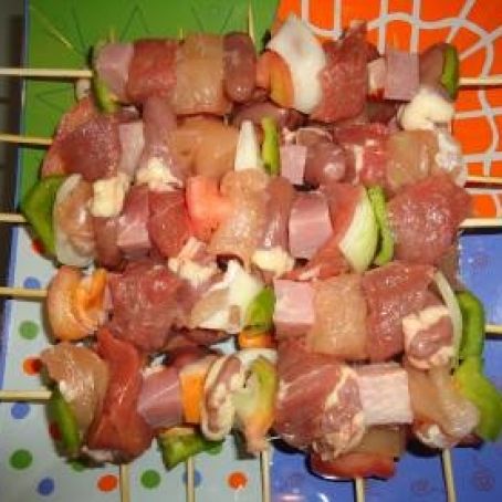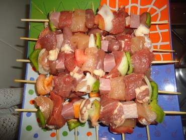 Corte todos os ingredientes em cubos e intercale um a um nos espetinhos