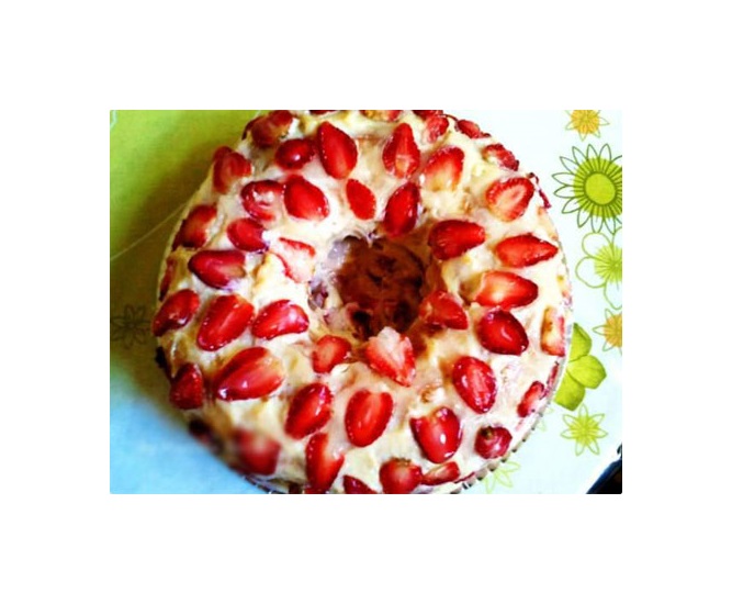 Cubra o bolo com o creme reservado para a cobertura e arrume as fatias de morango da forma que desejar.