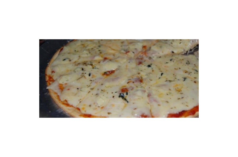 Bacon à moda: molho, muçarela, presunto, bacon, cebola, pimentão picado, ervilha, milho e orégano.