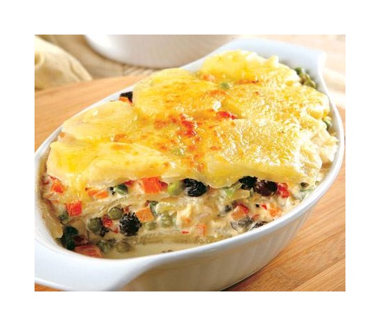 Arrume uma camada de batata num refratário, cubra com a mistura de creme de leite. Por cima, ponha a mussarela.