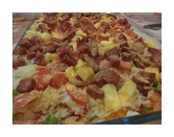 Frite a calabresa com as cebolas e reserve Em uma tigela coloque o arroz e misture com o leite, o creme de leite, o requeijão, sal, pimenta-do-reino e noz-moscada Em um refratário untado com manteiga coloque o arroz e intercale com as cenouras, vagem, pimentão, mussarela, tomates e o milho Coloque o resto do arroz e por cima coloque as calabresas fritas e peneire com o queijo parmesão e leve ao forno e deixe por 30 minutos