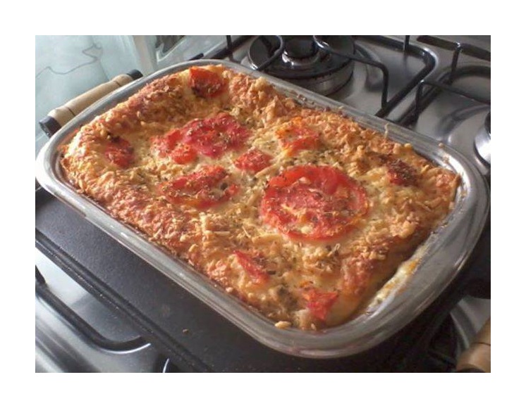 Em um refratário, untado com margarina faça a montagem: uma camada de pão de fôrma; metade da mistura batida; fatias de peito de peru; rodelas de tomate temperado com azeite; catupiry; camada de pão de forma; o restante da mistura batida.
