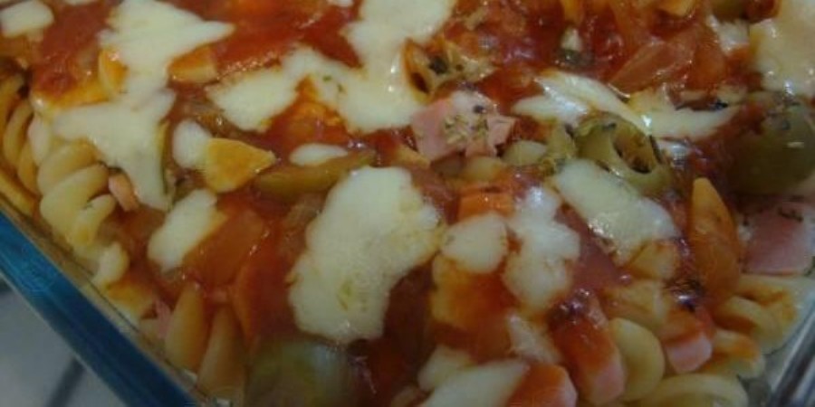 Em uma travessa coloque um fio de óleo e espalhe com um pincel ou com o dedo, coloque o macarrão cozido e jogue por cima o presunto cortado em fatias pequenas, o frango, as azeitonas, o óregano e metade do queijo cortado em fatias pequenas.