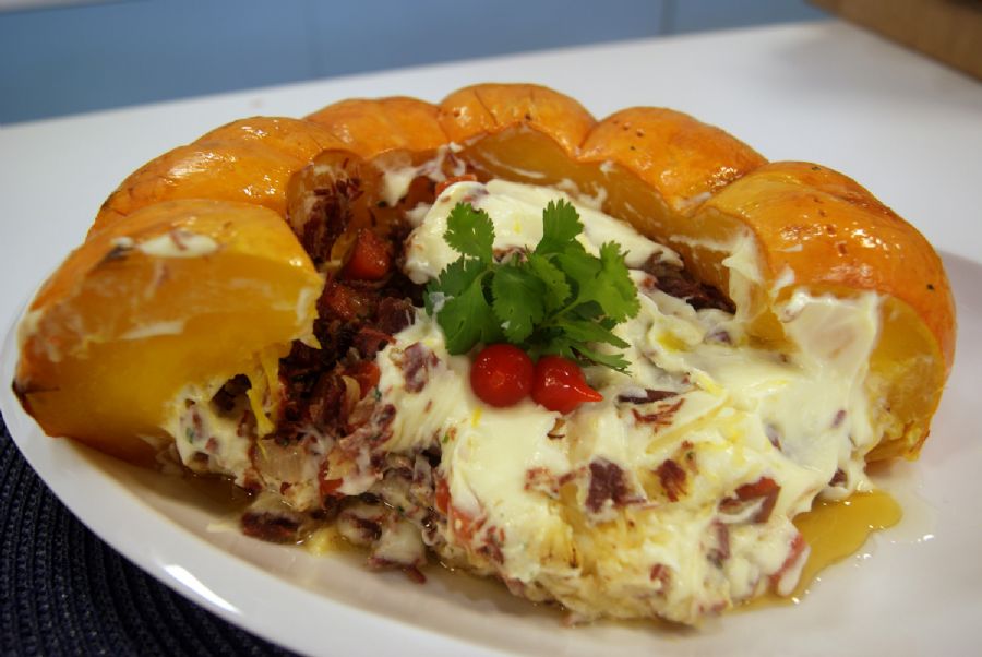 Recheia a moranga já cozida com a carne seca intercalando com o requeijão.