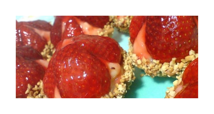 Pegue as massinhas já assadas e recheie com o creme, coloque morangos em cima, passe o creme brilho e dê o acabamento com Xerém