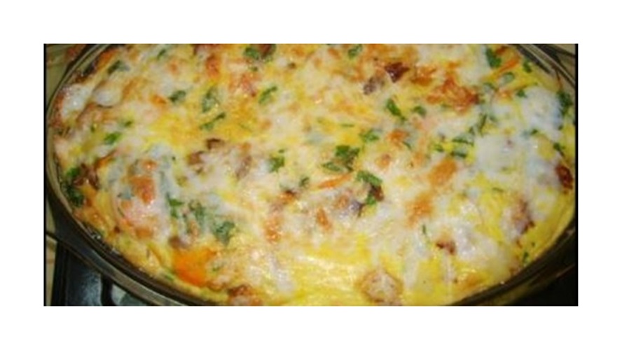 Numa tigela, bater os ovos com a Salsa picada sal e pimenta. Adicionar o preparado anterior aos ovos e envolver.