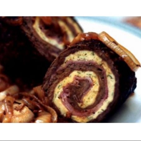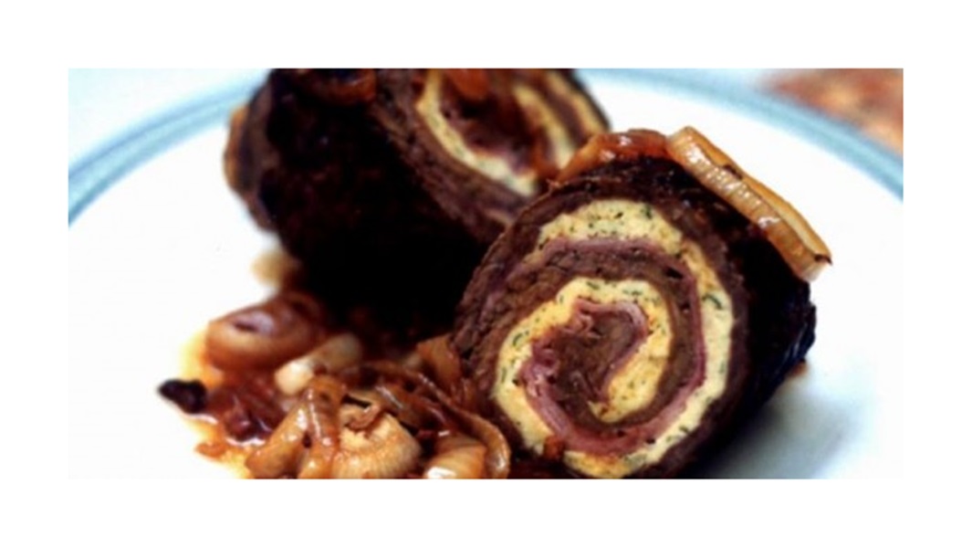 Tempere o bife, com sal e pimenta; coloque a fritada, sobre o bife, cubra com o presunto, enrole-o sobre si mesmo e prenda bem apertado com um pedaço de barbante.