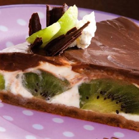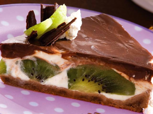 Amasse o cream cheese e misture o iogurte e o adoçante. Coloque sobre a massa e, em seguida, distribua o kiwi. Leve à geladeira.