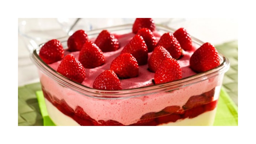 Sobre o creme já frio, espalhe os morangos e em seguida distribua as claras com a gelatina.