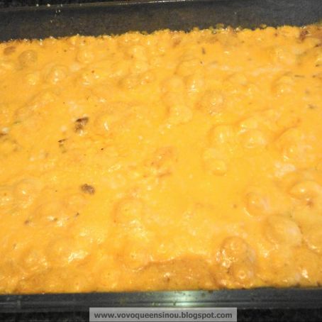 Peguei um refratário e untei com azeite, acrescentei a carne de porco desfiada, juntei o creme de abóbora, salpiquei queijo parmesão ralado. Levei ao forno pré- aquecido por 20 minutos mais ou menos.