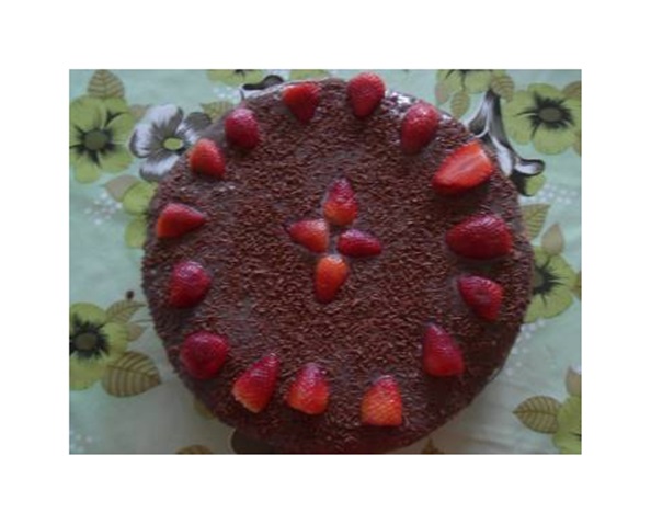 Desenforme o bolo depois de frio, corte ao meio, espalhe o recheio de morangos e cubra com o brigadeiro restante