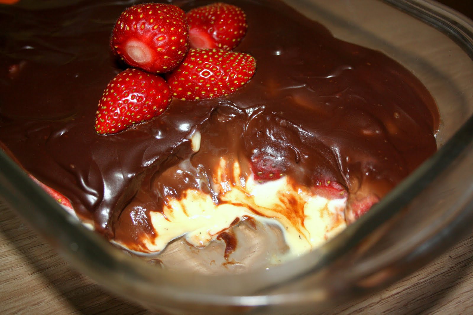 Despejar a cobertura por cima dos morangos e levar à geladeira, coberta por papel filme