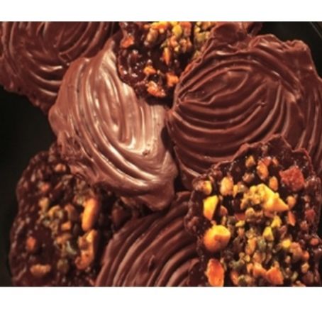 1. Aqueça o forno.2. Numa panela, misture o creme de leite com o mel e o açúcar e leve ao fogo, mexendo às vezes, até começar a ferver. Ao levantar fervura, pare de mexer e cozinhe por 15 minutos.3. Retire do fogo e junte as frutas secas.4. Misture rapidamente e ponha colheradas (sopa) da mistura na forma e deixe 8 cm de espaço entre eles.5. Leve ao forno (em assadeiras grandes forradas com papel-manteiga untado) por 10 minutos.6. Retire do forno e reserve por 1 minuto.7. Com uma colher, ajuste as bordas de cada biscoito para deixá-los no formato circular.8. Leve ao forno até dourarem. Retire e deixe esfriar.9. Pique e derreta o chocolate em banho-maria ou micro-ondas.10. Coloque em uma superfície lisa e mexa o chocolate com uma espátula para resfriá-lo.11. Destaque os biscoitos do papel e pincele o chocolate no verso.12. Deixe secar e sirva.