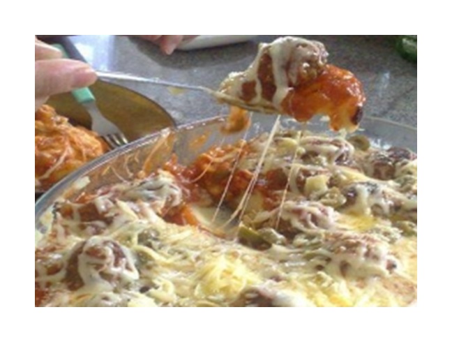 Por cima as almôndegas com o molhos e por último o queijo e o orégano