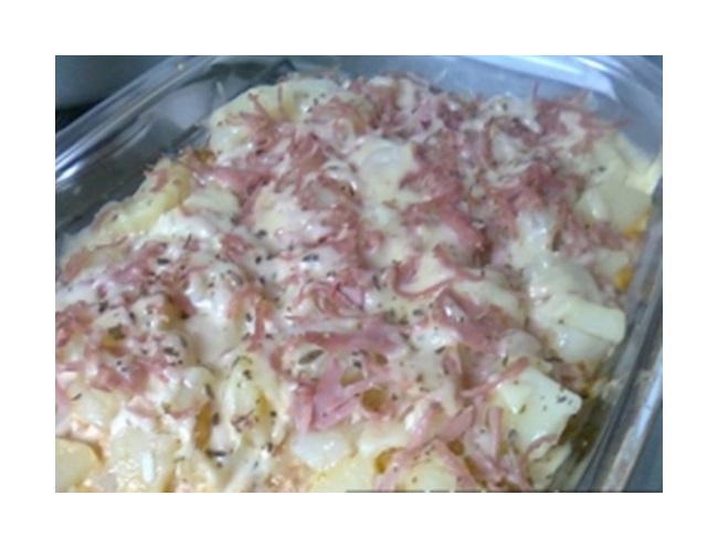A seguir, despeje espalhando por cima do molho, o requeijão e em seguida, as batatas já cozidas.