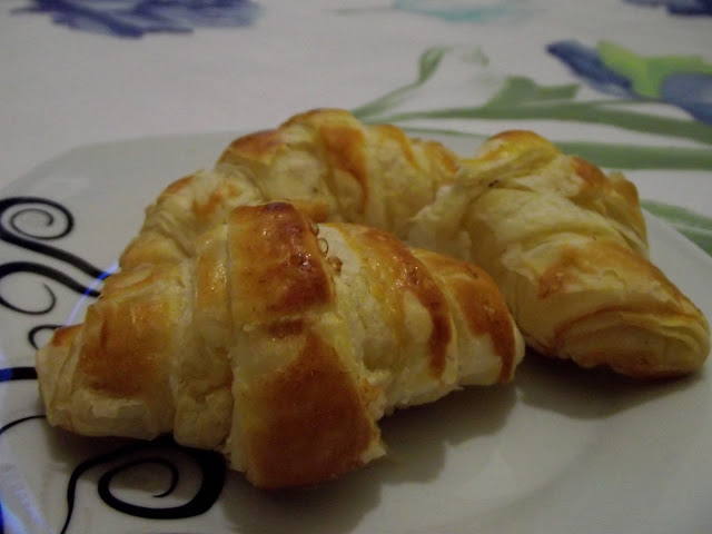 Pincele cada croissant com um pouco de gema, e asse em forno bem quente (>250°C) por 20 minutos ou até que a gema esteja bem dourada.